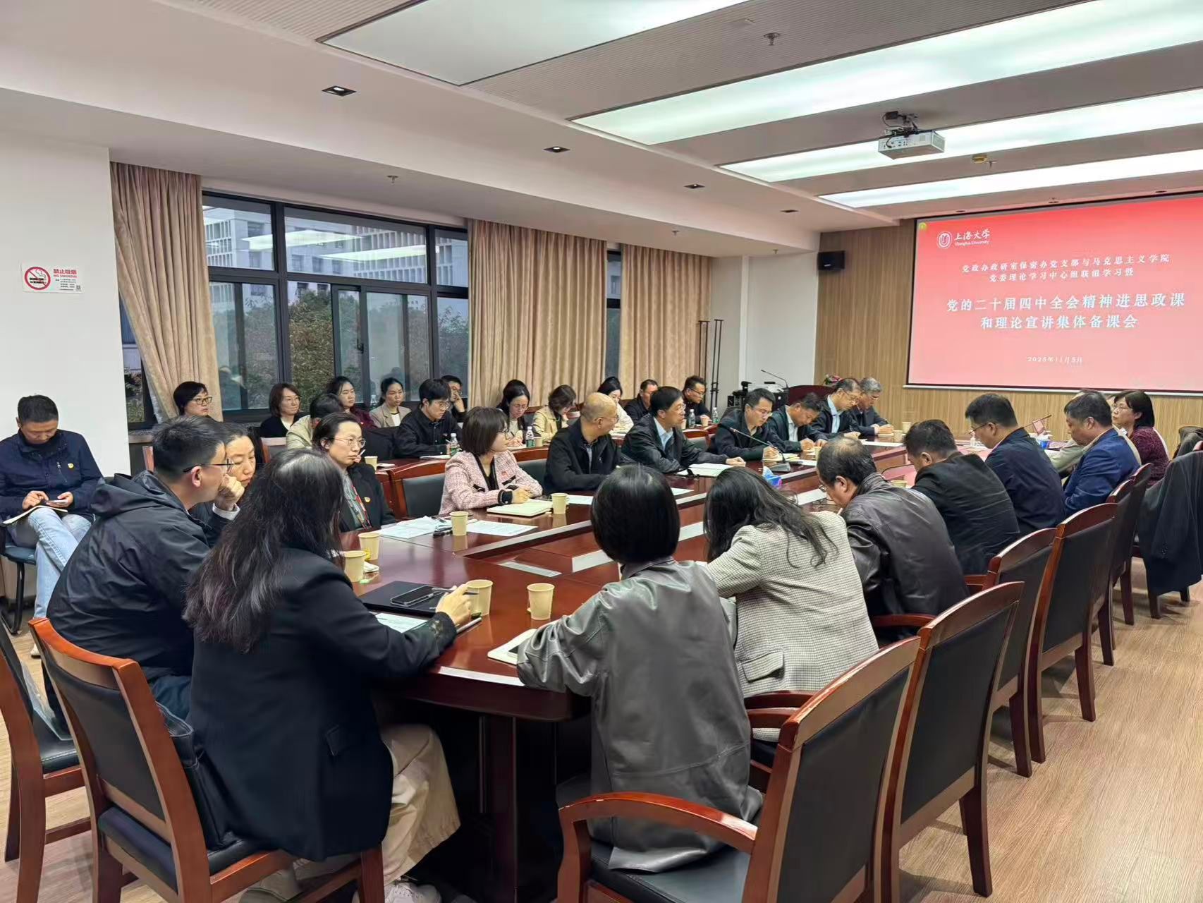 2025年11月5日,党政办政研室保密办党支部与马院党委理论学习组联组学习,本次活动主要围绕学习贯彻党的二十届四中全会精神学习进行。党政办政研室保密办党支部全体党员、马克思主义学院党委理论学习中心组成员及学院思政课教师代表70余人参加学习会。会议由马克思主义学院党委书记王国建主持。