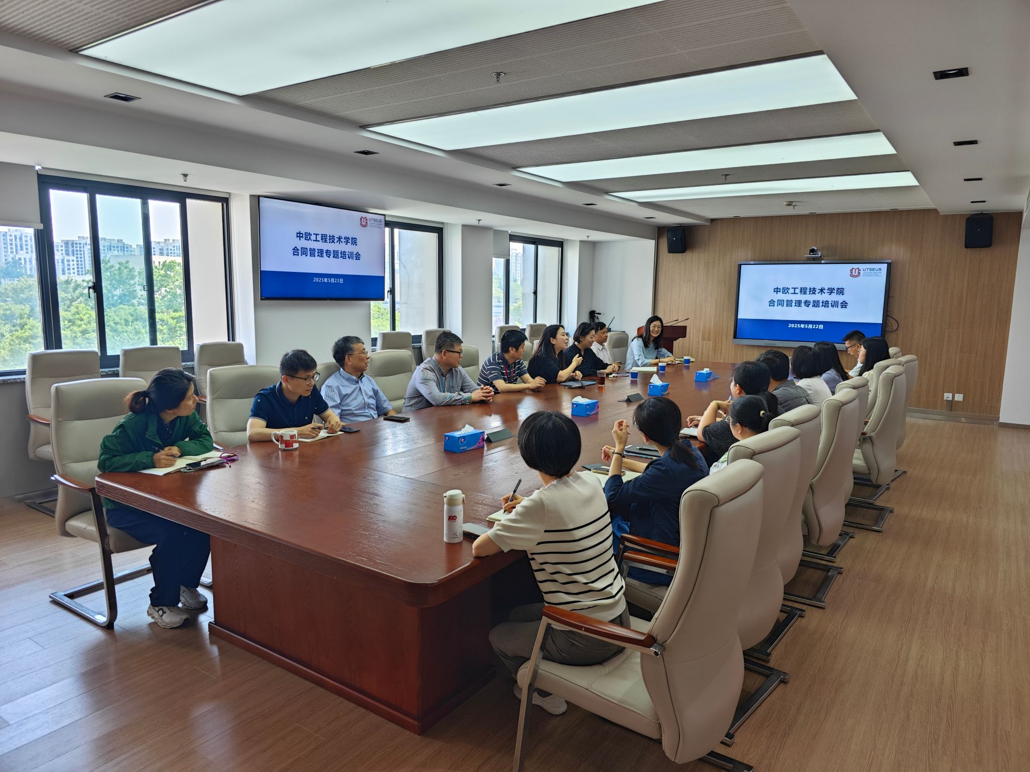5月22日,应中欧工程技术学院邀请,党政办公室法务办公室朱曈、胡猛、潘美瑜前往中欧工程技术学院开展合同管理办法宣讲会。中欧工程技术学院党委书记刘建勇、执行院长王勇、特约党建研究员吴仲纲、副院长何卓衡,以及学院行政人员、辅导员等参加会议。会议由中欧工程技术学院学工负责人隋萍萍主持。